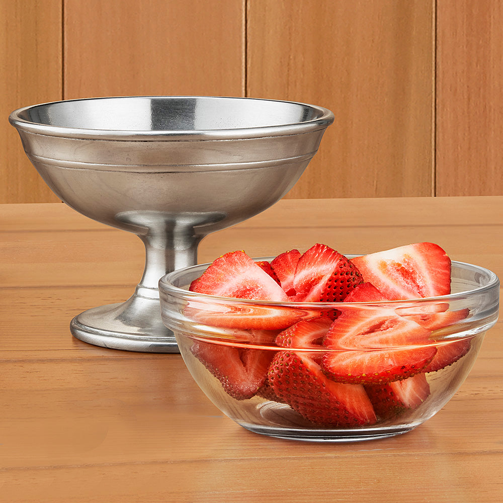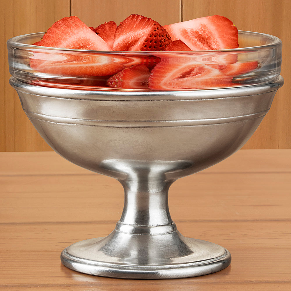 Effortlessly transform a table for formal occasions or make everyday experiences more special. Serve your favorite sweets in this handcrafted dessert dish with a glass bowl nestled in the warm luster of pewter.